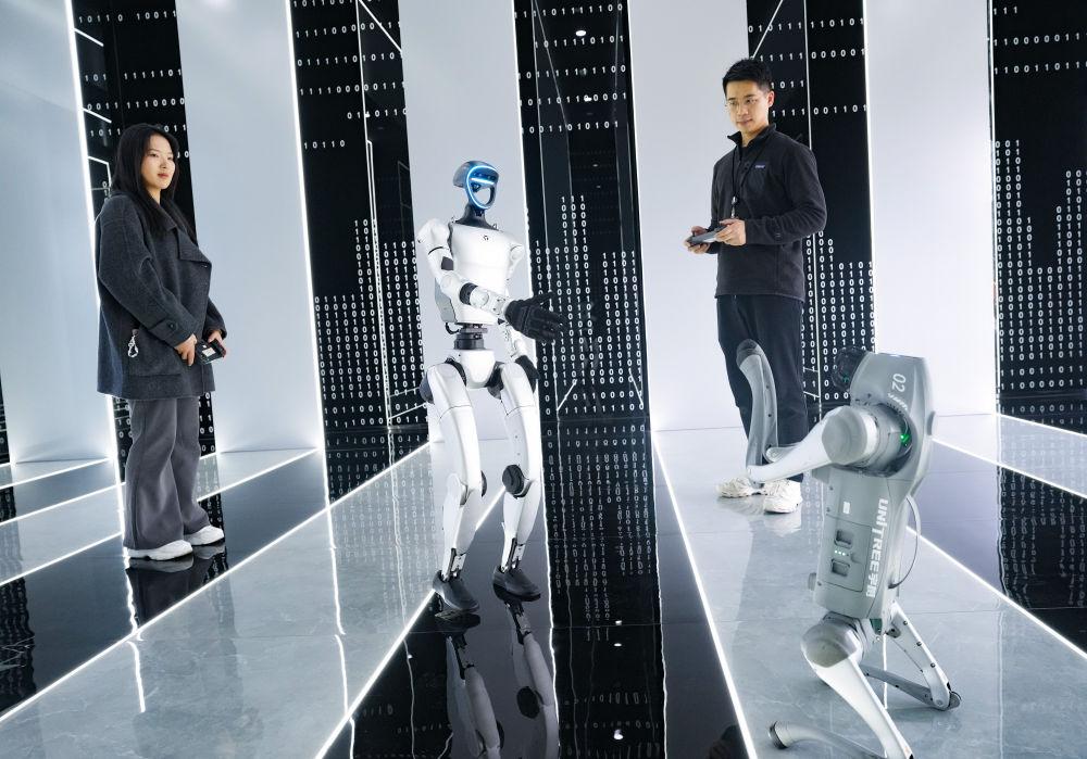 3月1日,在杭州宇树科技有限公司的产品展示中心,人形机器人和四足机器人在工作人员控制下做动作。新华社记者 翁忻旸 摄