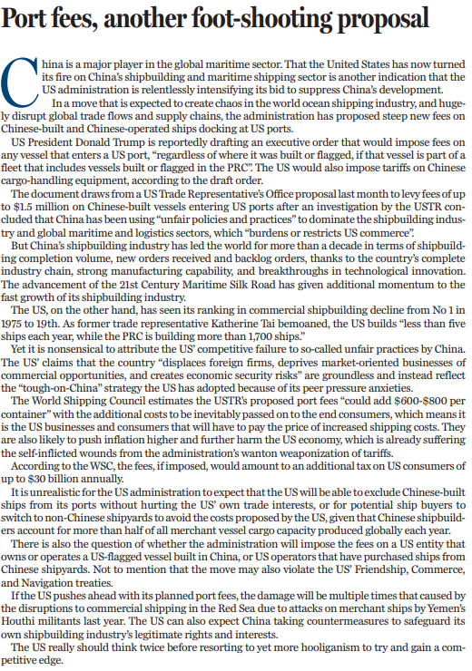 如果美方坚持征收港口停靠费,造成的损失或将是去年也门胡塞武装袭击商船导致红海商业航运中断的数倍。同时,美国可能还将面临中国为保护其船舶制造业的合法权益而采取的反制措施。