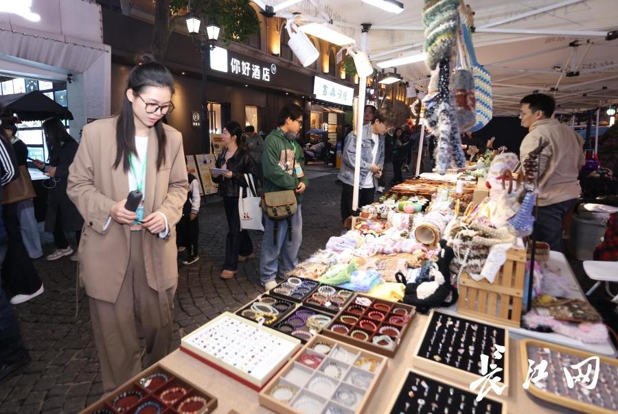 夜灯初上,黎黄陂路上也愈发热闹起来,创意集市里人头涌动,各种新奇的创意产品也引起了实践团成员们的兴趣。华中师范大学新闻传播学院2024级新闻与传播专业研究生余典主动给大家当起了“导游”。