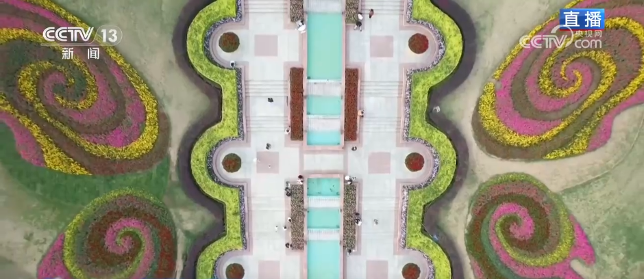 中轴线两侧矮牵牛、三色堇、一串红、金鱼草和孔雀草等草花拼成蝴蝶状色块,色彩缤纷。园中的谊园草坪、吊瓜树草坪自2022年元旦开放后,已成为市民春日露营的好去处。