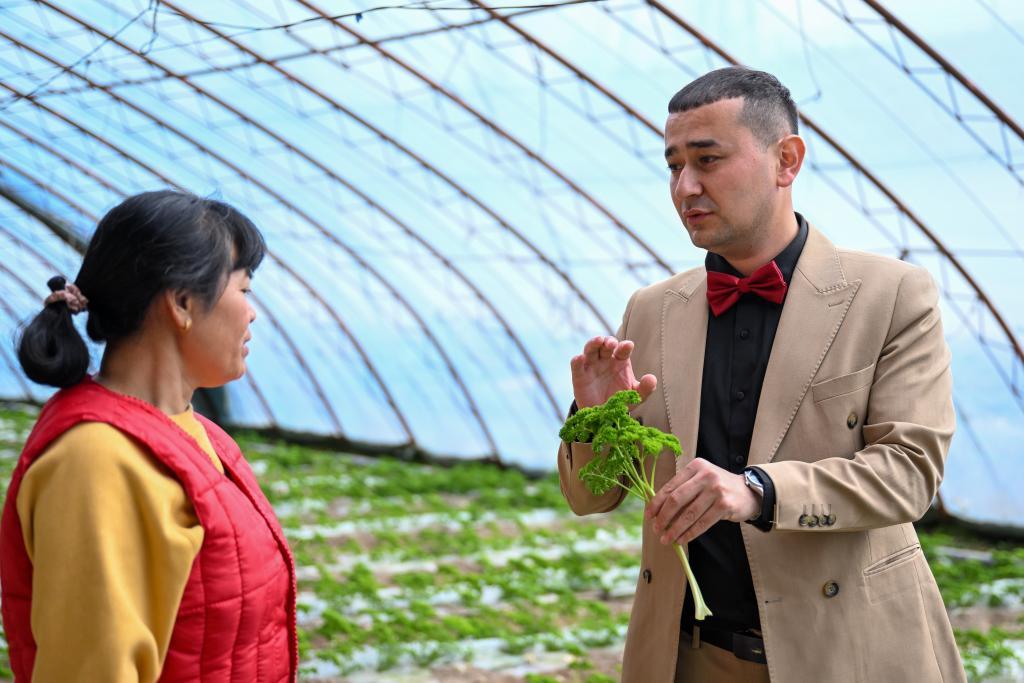 在新疆伊犁哈萨克自治州察布查尔锡伯自治县科技示范基地,依木拉·亚尔买买提(右)和农户交流(3月7日摄)。新华社记者 丁磊 摄