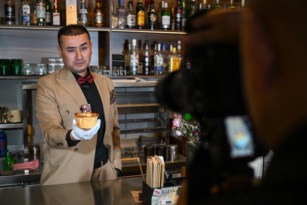 新华社乌鲁木齐3月14日电 见到依木拉·亚尔买买提时,他正和团队在一家咖啡店里拍摄新疆特色饮品——馕咖啡。身着一身西装礼服、手戴白手套,只见他在各种镜头前往杯子形状的馕里加入滚烫的牛奶、咖啡,一杯新疆版的“馕布奇诺”热乎上桌。