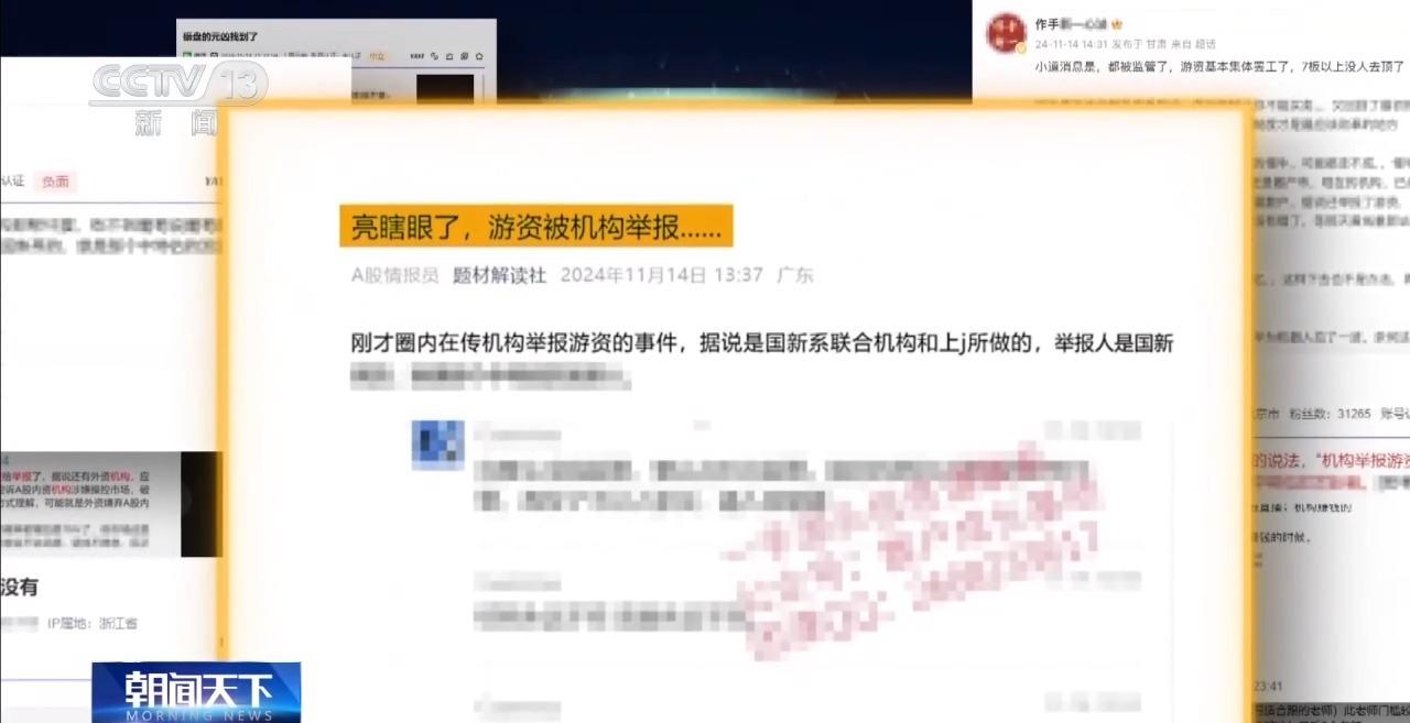总台央视记者 李厦:我们顺着网上的帖子一路摸排发现,2024年11月14日午后1点多,一个名为“题材解读社”的公众号发布了这篇文章,直指国新投资联合多家机构举报游资操控市场。