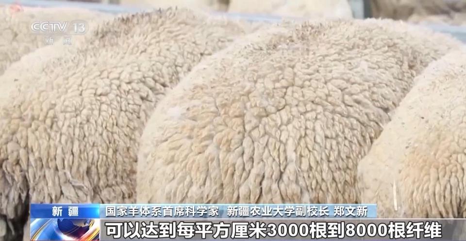 国家羊体系首席科学家 新疆农业大学副校长 郑文新:像我们细毛羊毛的密度可以达到每平方厘米3000根到8000根纤维,毛的密度非常大;而粗毛羊毛的密度基本上是几百根。我们通过杂交,让哈萨克羊的毛密度变大。因为这片草场上生长的这个草就这么多,充分考虑到羊毛的厚度适中,能更少消耗草原上的植被,用草原上相同的草,生产出更多的肉。