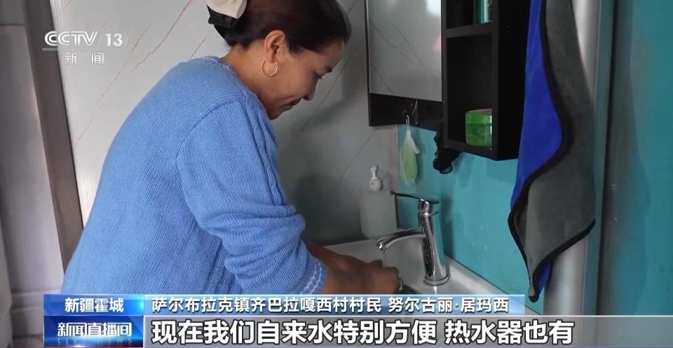 萨尔布拉克镇齐巴拉嘎西村村民 努尔古丽·居玛西:我们以前在山上的时候,要在河坝里取水,有的时候骑马提水,有的时候自己提过来。现在自来水特别方便,热水器也有,洗澡、洗碗都是热热的水。