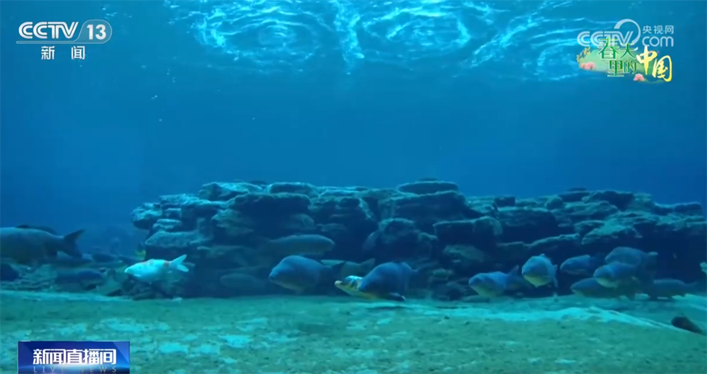 刚才我们感受了从天空到地面的春色,我们继续把视角往下,来到泉下的世界。得到有关部门的允许,我们通过水下无人机深入泉底,在这个视角里,清澈的泉水中,水草摇曳、鱼群穿梭,活力满满。实际上,趵突泉的泉水一年四季恒定在18℃左右,可以说这里的水下世界四季如春。所以在济南有这么一句话——济南的春天是从泉水中醒来的,而这句话在趵突泉公园有了具象化的体现。