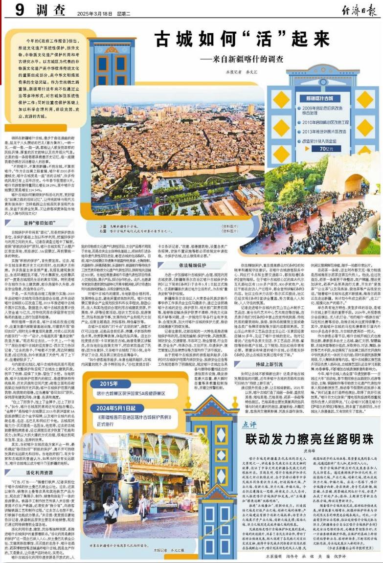 今年的《政府工作报告》提出,推进文化遗产系统性保护,提升文物、非物质文化遗产保护利用和考古研究水平。以古城区为代表的非物质文化遗产是中华优秀传统文化的重要组成部分,是中华文明绵延传承的生动见证。作为古丝绸之路重镇,新疆喀什近年来不仅通过立法等多种形式,对古城加强系统性保护工作;同时注重在保护基础上加以科学合理利用,建设宜居、宜业、宜游的古城。