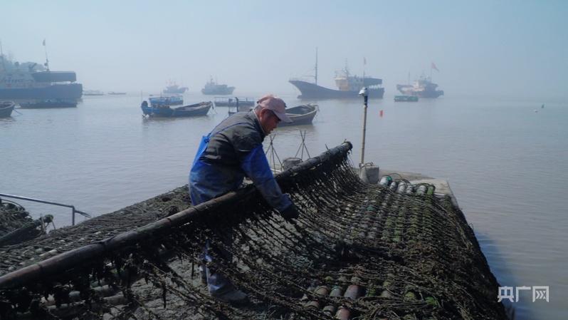大岙村紫菜养殖户虞新解清理紫菜养殖排架(央广网发 吴宝春 摄)