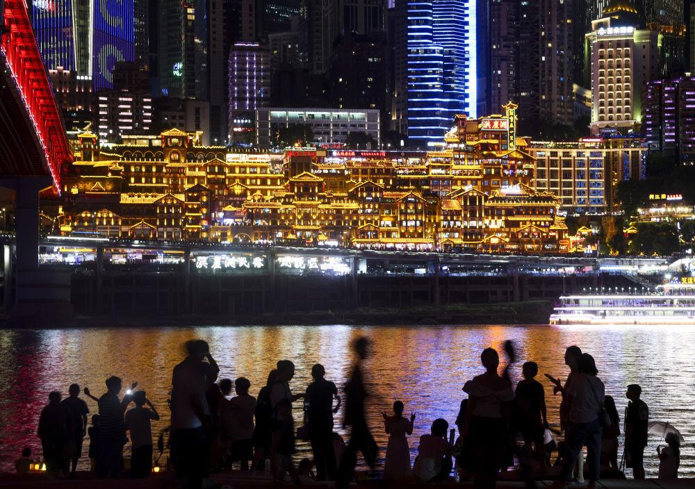2024年8月23日,在重庆江北区嘉陵江畔,游客在打卡重庆知名网红景点——洪崖洞景区夜景。新华社记者 刘潺 摄