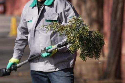 记者在位于北京东四环的红领巾公园里看到,一辆水车尾灯双闪、缓缓行进,站在车上的工作人员手持高压水枪对圆柏开展冲淋作业,花粉顺着水流不断落地。另一旁,园林工作人员对开花较多的枝条进行修剪。