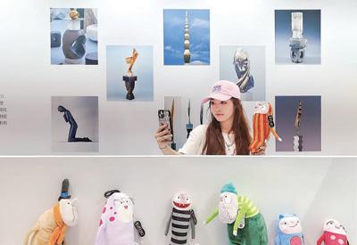 浙江宁波,参观者在展会上与文创作品合照。会展经济火热,文创产品走红,不断满足青年群体文化消费的新需求。胡学军摄(影像中国)
