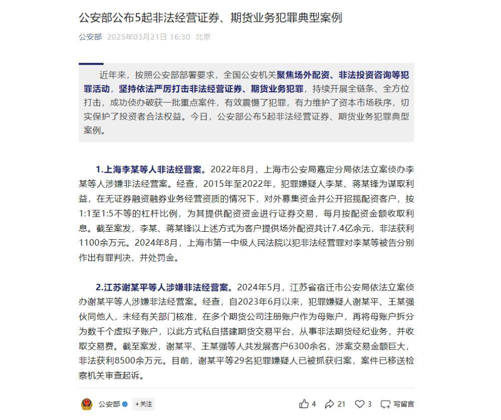近年来,按照公安部部署要求,全国公安机关聚焦场外配资、非法投资咨询等犯罪活动,坚持依法严厉打击非法经营证券、期货业务犯罪,持续开展全链条、全方位打击,成功侦办破获一批重点案件,有效震慑了犯罪,有力维护了资本市场秩序,切实保护了投资者合法权益。今日,公安部公布5起非法经营证券、期货业务犯罪典型案例。