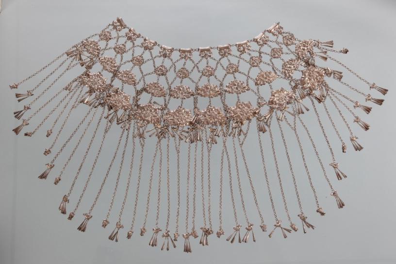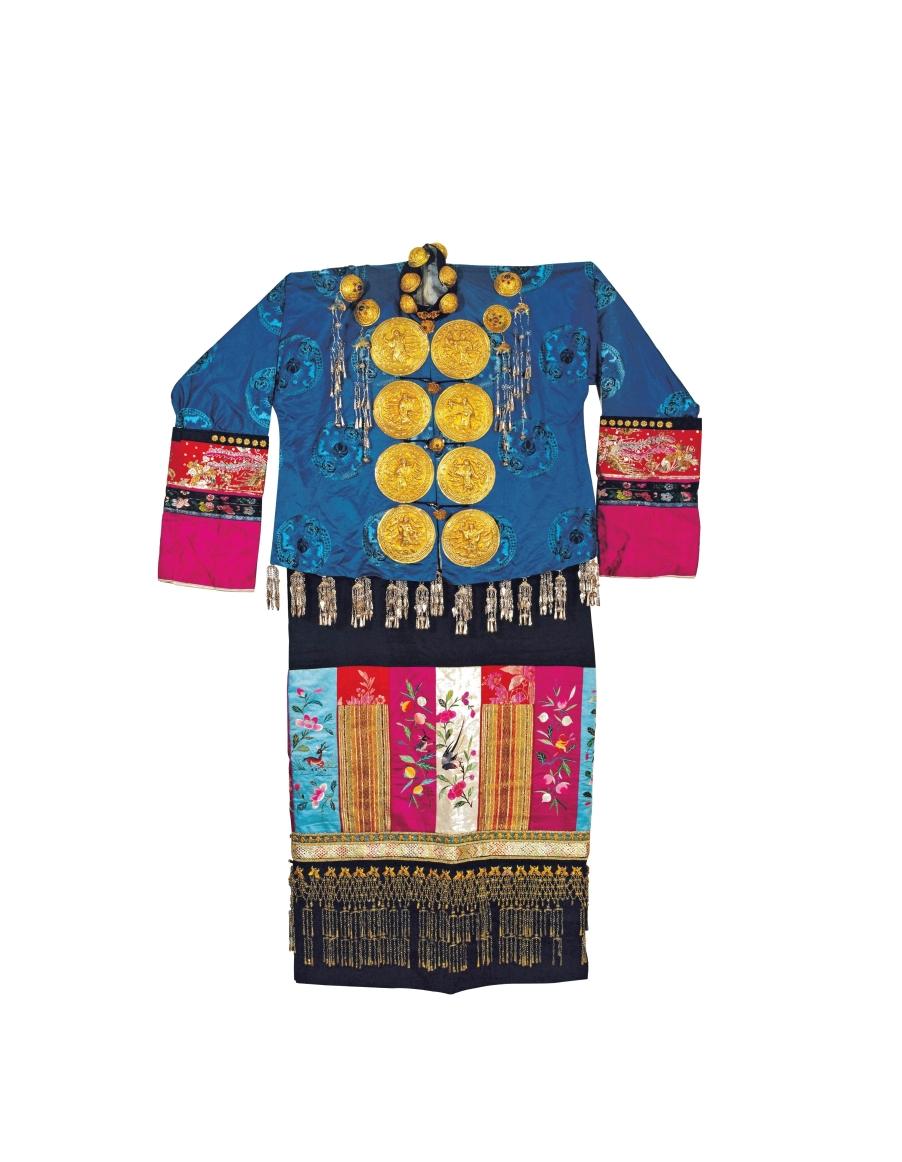 整套衣裙色彩搭配巧妙和谐、装饰华丽