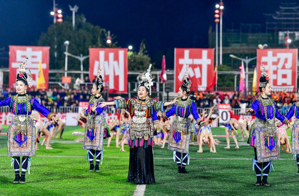 2025年3月14日,2025年贵州“村超”40强交叉赛在榕江“村超”足球场举行,演员在比赛间隙表演侗族大歌,民族文化伴随着体育赛事成功“出圈”。图片来源:新华社