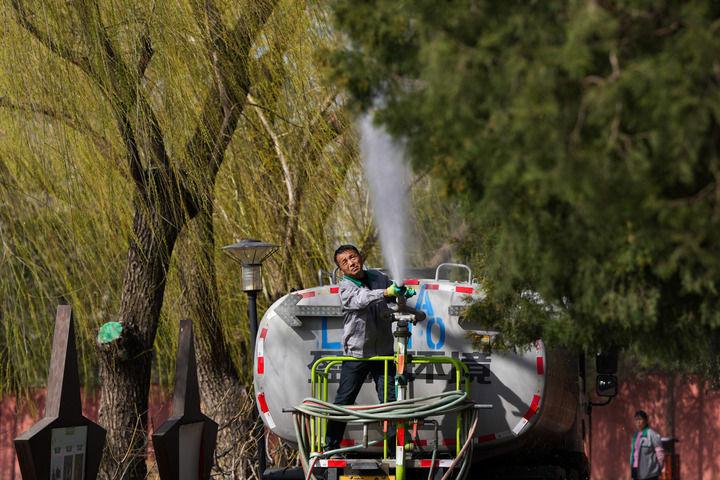 在北京天坛公园内,工作人员对柏树进行喷淋(3月21日摄)。新华社记者 鞠焕宗 摄