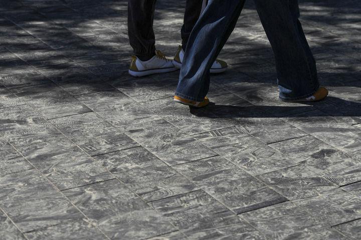 在北京天坛公园,游人走过一处覆盖着柏树花粉的地面(3月20日摄)。新华社记者 鞠焕宗 摄
