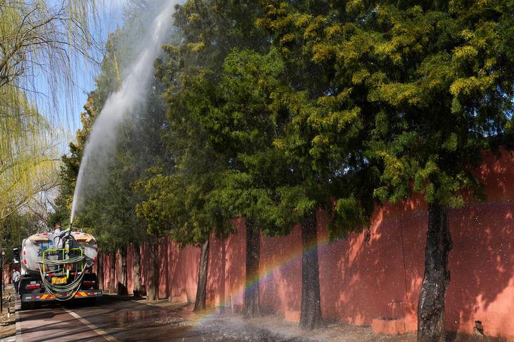 在北京天坛公园,工作人员驾驶雾炮车对飘散花粉的柏树进行喷淋(3月20日摄)。新华社记者 鞠焕宗 摄