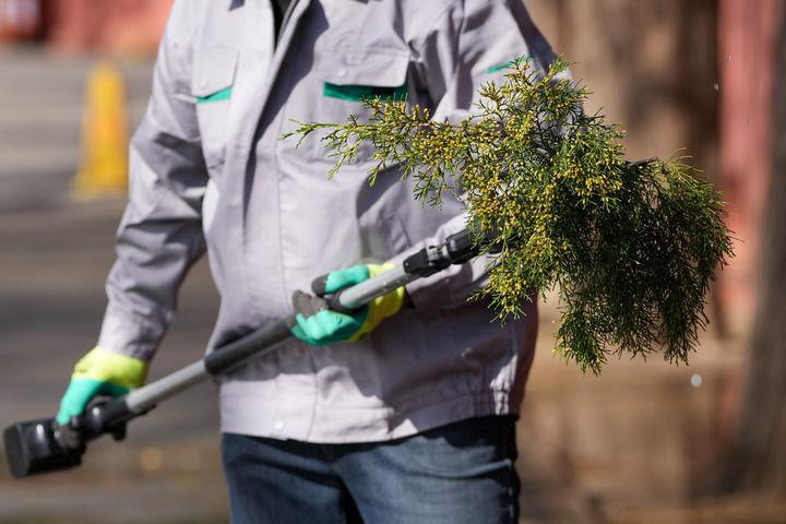 在北京红领巾公园内,工作人员修剪开花的柏树(3月19日摄)。新华社记者 鞠焕宗 摄