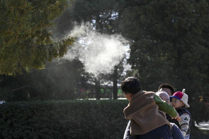 3月20日上午9时许,记者从北京天坛公园东门进入,看到花粉如烟雾般笼罩在通往祈年殿的步道上空,树像“冒烟了”一般;地面上覆盖着一层飘落的花粉,留下许多游客的脚印;不少游客戴着口罩,掩着口鼻。约9时40分,公园工作人员开着雾炮车对着柏树喷淋。然而,随着风力增大,公园上空又飘起了花粉雾。