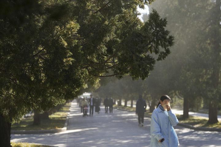 在北京天坛公园,柏树飘落大量花粉,游人掩鼻而行(3月20日摄)。新华社记者 鞠焕宗 摄