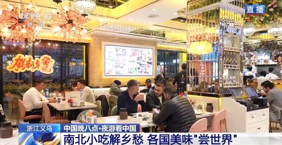 此外,马路另一侧,还能品尝世界美味,来自世界各地的大厨,直接把餐馆开到了义乌,让你无需搭乘飞机就能尝到异国风味。在这里不仅能够听到天南海北的口音,还能看到不少外国游客也一起“逛吃逛吃”,在这一刻,美食或许就是“通用语言”。
