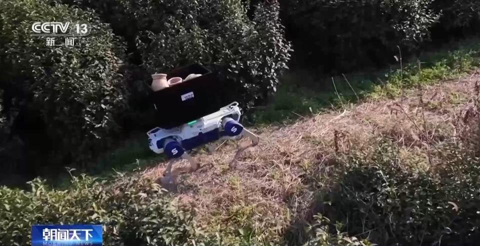 在径山的茶山上,小朋友们正在茶农的指导下体验“小小采茶工”的工作,一片片茶芽被陆续放进茶篓中,再由“机器狗”驮着茶篓稳稳行走在崎岖的山路上,护送这些新叶快速到达炒茶车间。