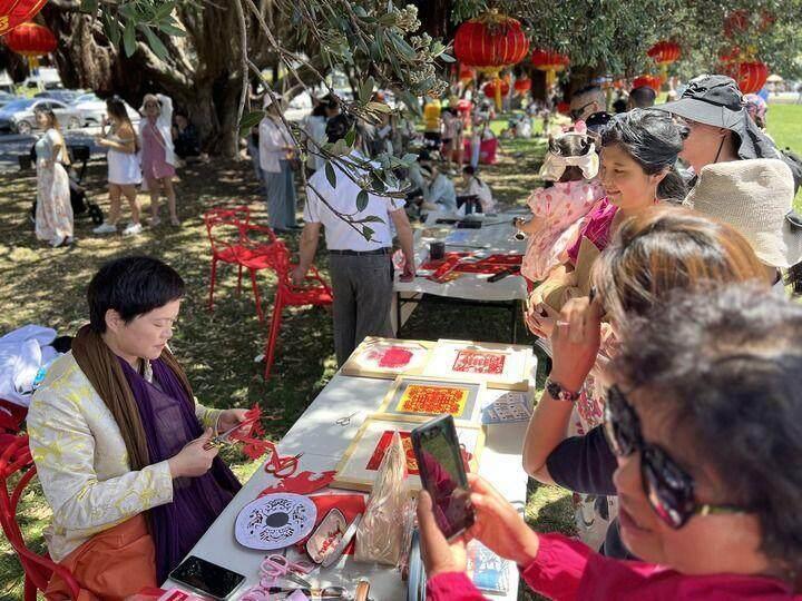 2024年2月4日,湖北鄂州雕花剪纸省级代表性传承人曹小琴在新西兰向当地民众展示剪纸技艺。新华社发