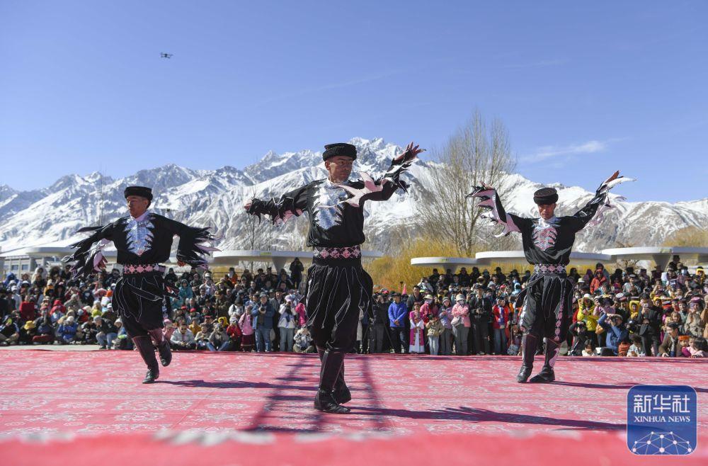 ↑ 在新疆塔什库尔干塔吉克自治县提孜那甫乡赛马场,参与非遗展演的村民在跳舞(3月23日摄)。