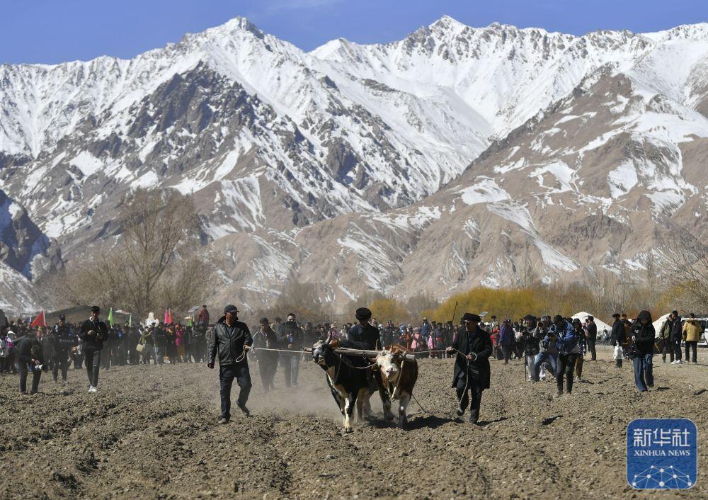 ↑ 在新疆塔什库尔干塔吉克自治县“彩云人家”民俗村,村民为游客表演传统农业生产中的犁地方式——“二牛抬杠”(3月22日摄)。