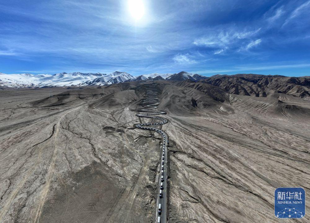 ↑ 3月22日,在新疆塔什库尔干塔吉克自治县,参加“盘龙古道”恢复通车仪式的车队在行进中(无人机照片)。