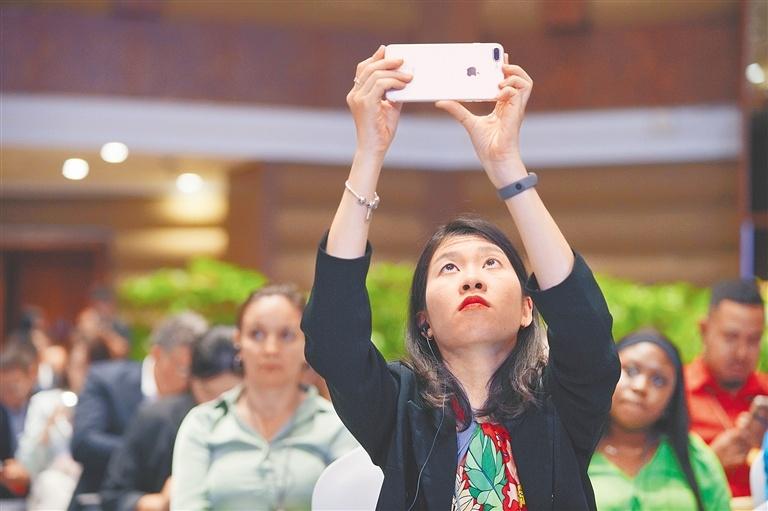 在全球自由贸易港发展论坛现场,与会嘉宾用手机记录。海南日报全媒体记者 王程龙 摄