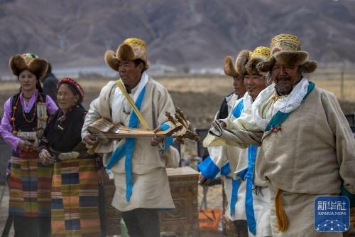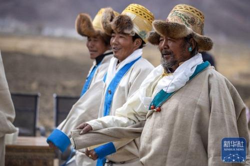↑ 尼玛(右一)在春耕仪式上带领村民载歌载舞(3月16日摄)。