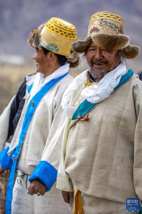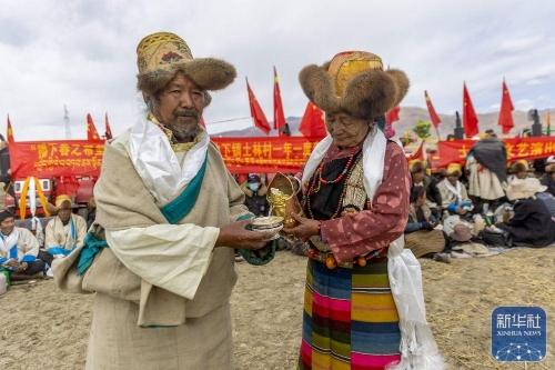 ↑ 作为村中长者,尼玛(左)在春耕仪式上接受敬酒(3月16日摄)。