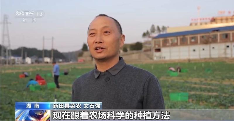 湖南新田县菜农 文石强:以前我们是传统的种植方法,现在不同了,现在跟着农场科学的种植方法,这个菜的品质上来了,(收入)比以前提高了两三倍。