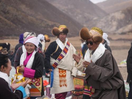 旺庆老人(前排带墨镜者)在春耕大典上为客人敬酒献唱(3月16日摄)。
