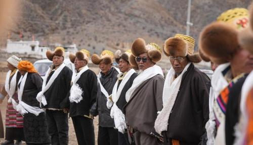 旺庆老人(左七)在春耕大典上唱颂词(3月16日摄)。