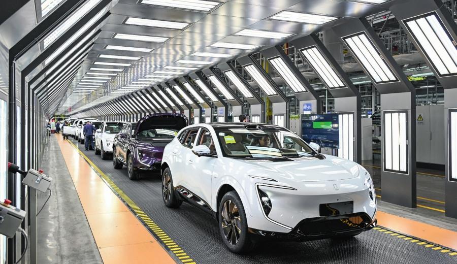 位于重庆市渝北区的长安汽车数智工厂总装车间拍摄的即将下线的新能源汽车(2025 年 3 月 6 日摄) 王全超摄 / 《瞭望》