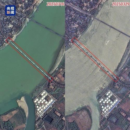 △缅甸地震受灾前后光学卫星图像(灾前:高分一号03卫星2025年3月16日采集,灾后:资源一号02D卫星2025年3月29日采集)
