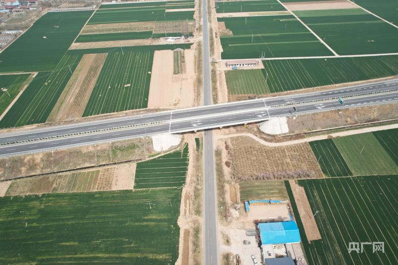 从空中俯瞰,兰原高速(横向)与鲁陈路(纵向)成十字形(央广网发 赵梦阳 摄)