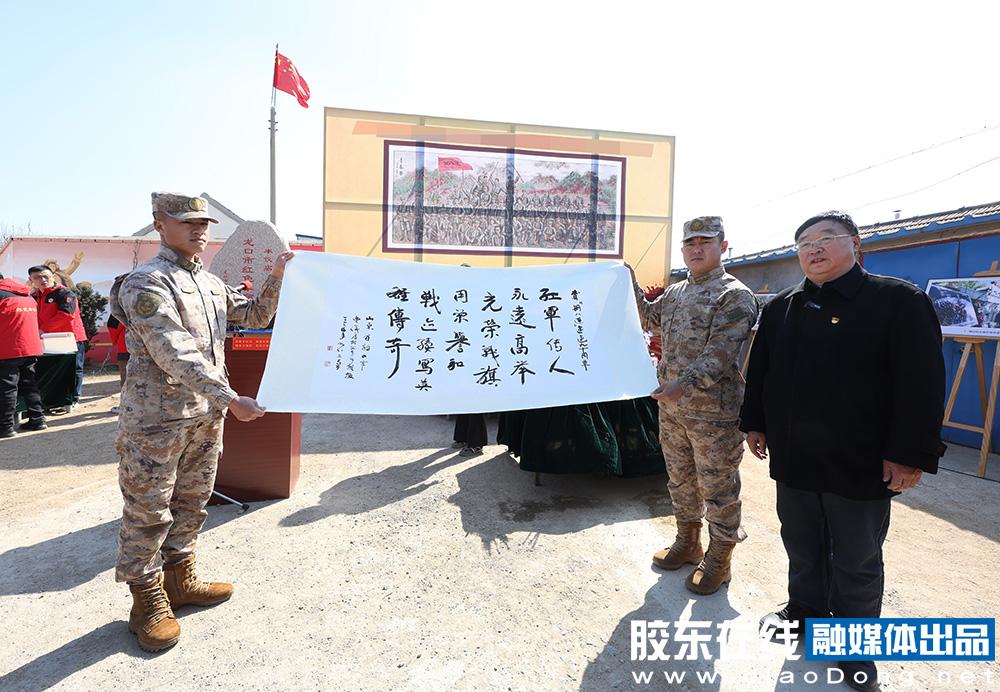 胶东在线3月30日讯 30日,龙口市丰仪店战斗展览馆门前,举行纪念丰仪店战斗83周年仪式。济南第一团“钢八连”指战员和丰仪店村父老乡亲及英烈后人,与53位抗日无名先烈画像合拍“全家福”,共同缅怀先烈,传承红色精神。