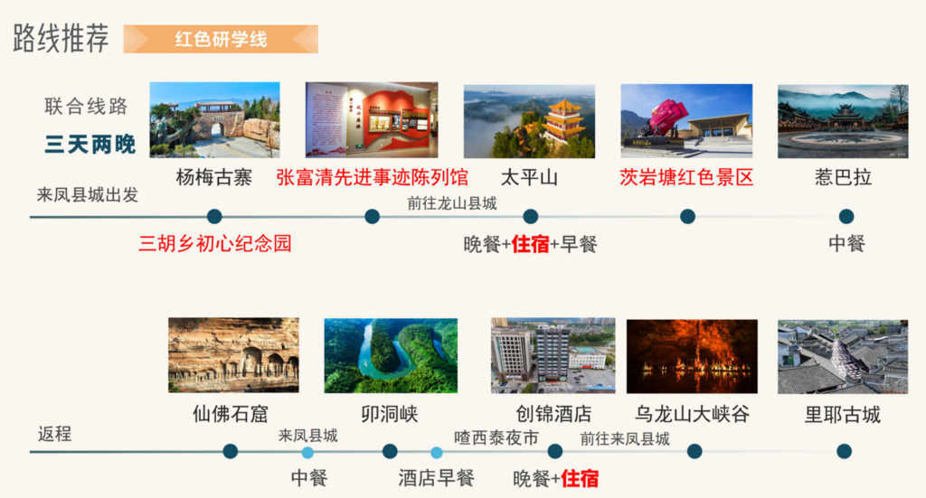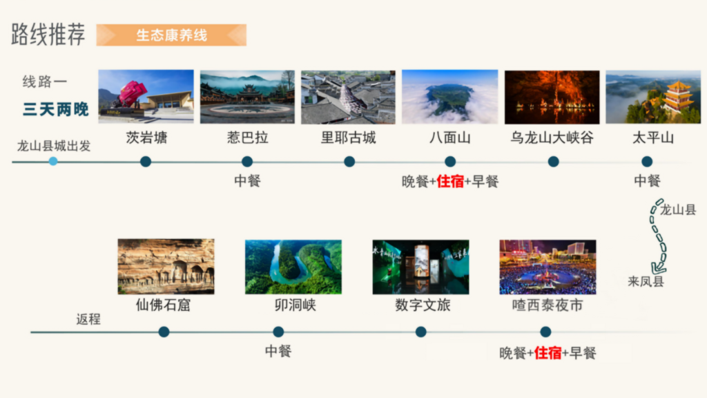 来凤县和龙山县的旅游资源远不止于此。来凤县除了拥有众多自然景观和民俗文化,还是中国民间文化艺术之乡、中国原生态摆手舞之乡,藤茶、金丝桐油等特产丰富,为游客带来独特的舌尖体验。龙山县历史底蕴深厚,出土的3.7万余枚里耶秦简“复活”秦朝历史,209项非遗代表性项目彰显民族风情,任弼时、贺龙等老一辈革命家在此创建湘鄂川黔革命根据地,让这里成为红色旅游的热门之选。