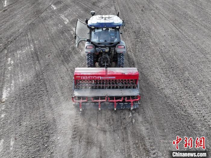 新疆巴音郭楞蒙古自治州库尔勒市,搭载北斗导航系统的播种机在田间有序作业。确·胡热 摄