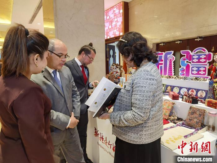 3月31日,新疆在北京举办有关国家驻华使节交流会,来自43个国家和国际组织的70位外宾出席。图为外宾在新疆特色产品展区参观。中新社记者 徐雪莹 摄