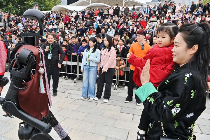 开幕式上,“科技范儿”成为关键词。除了机器人“刘三姐”,在蛇年春晚上手持花绢扭秧歌“出圈”的同款人形机器人也来到广西,脱下花棉袄,穿上壮锦马甲,和街舞少年们共舞。