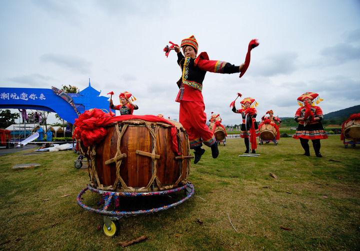 演员在广西南宁青秀山风景区表演节目,迎接“三月三”佳节的到来(3月29日摄)。新华社记者 周华 摄