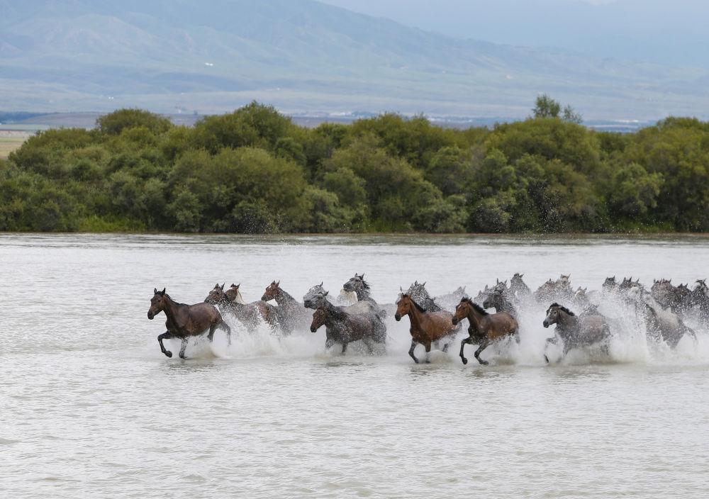 2024年7月11日在新疆昭苏湿地公园拍摄的天马浴河。新华社记者 陈朔 摄