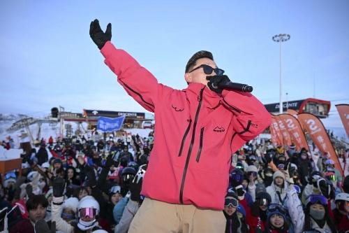 这是在新疆阿勒泰将军山国际滑雪度假区,主持人李权在“夕阳派对”上与游客互动(2025年1月28日摄)。新华社记者 胡虎虎 摄