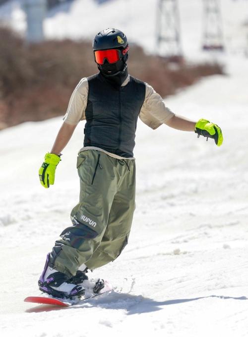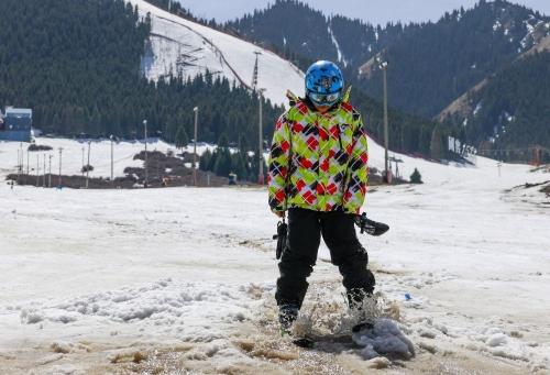 这是一名雪友在新疆丝绸之路山地度假区滑雪,部分区域的积雪已经融化(2025年4月5日摄)。新华社记者 王菲 摄