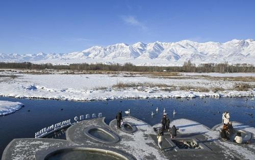 这是游客在新疆温泉国家湿地公园内体验温泉(2024年12月22日摄)。新华社记者 陈朔 摄