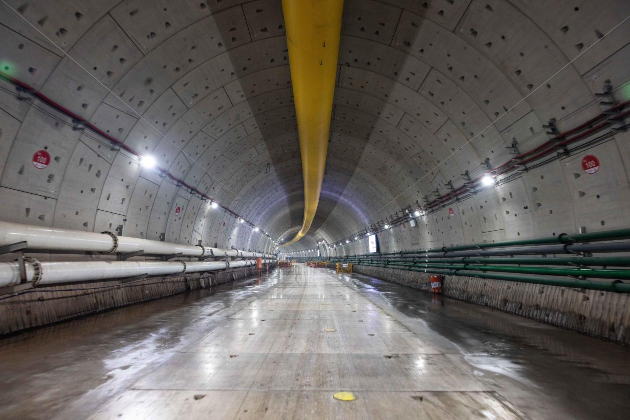 海底隧道的建设也能有效缓解城市交通压力。海珠湾隧道是广州首条超大直径盾构隧道,地跨广州海珠区和番禺区,全长4.35公里,采用BIM、北斗等技术及自主研发的IPM系统。2025年2月,海珠湾隧道6座横向联络通道全部贯通,成为国内首个在超大直径水下盾构隧道中采用机械法完成联络通道的项目。该隧道预计于2025年6月建成并全面通车,建成后将缩短广州中心城区至广州南站车程,减轻周边交通压力。图为海珠湾隧道工程盾构隧道段双线贯通。